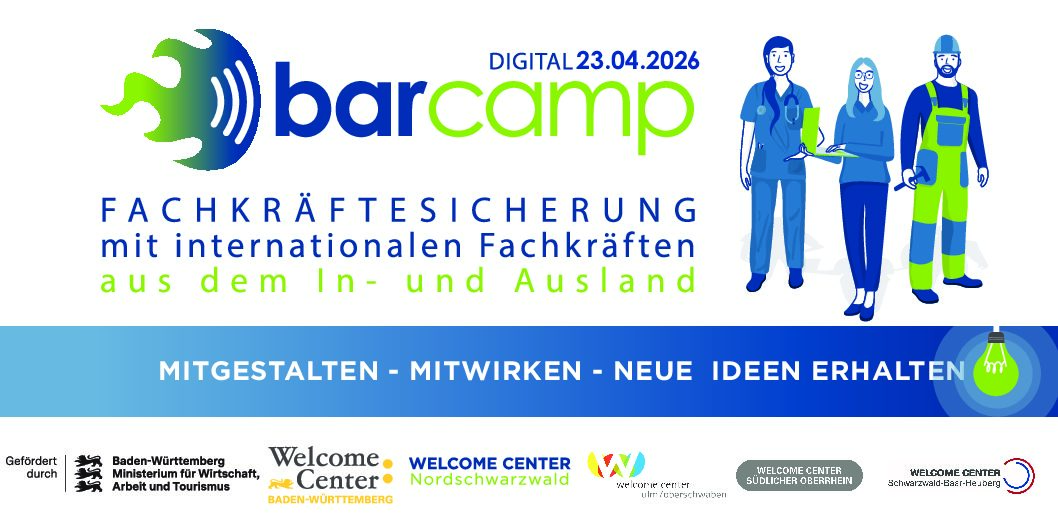 Diesen Fragen widmet sich unser digitales Barcamp am 23. April 2026 von 09:00 bis 12:00 Uhr, das wir gemeinsam mit weiteren Welcome Centern aus der Region organisieren. Die Veranstaltung richtet sich an Unternehmerinnen und Unternehmer, Personalverantwortliche sowie internationale Fachkräfte und alle, die sich mit dem Thema Fachkräftesicherung beschäftigen.